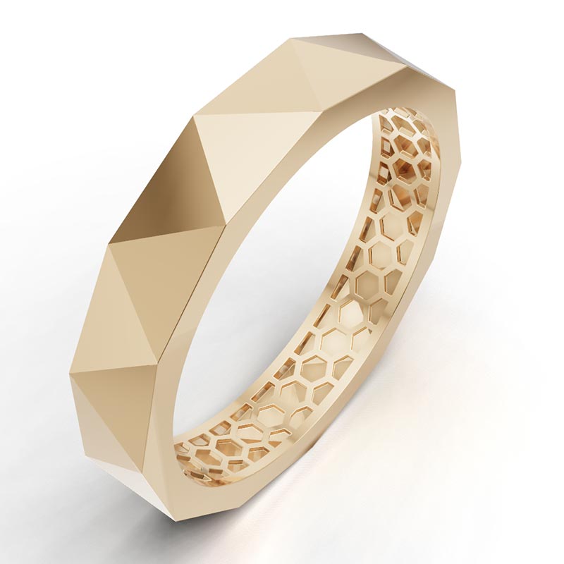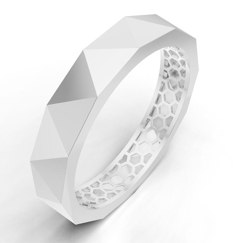 انگشتر هگزا فلو با هندسه چندوجهی و ساختار شش‌ضلعی داخلی، مدلی مدرن، سبک و مناسب تولید حرفه‌ای است.